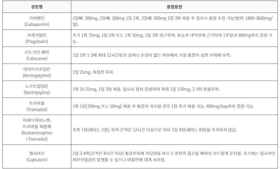 2) 신경통의 경감을 위한 약제 대상포진 후 신경통(Postherpetic neuralgia, PHN)는 대상포진을 앓고 난 이후 지속적인 신경통을 호소하는 경우를 말합니다. 이러한 통증은 대상포진의 통증에 비해 더 불쾌하게 느껴지는 경향이 있으며, 신체정신적인 기능의 장애로 삶의 질이 현저하게 저하되는 경향이 있습니다. 다음의 약물들은 이러한 통증의 경감을 위해 사용됩니다.